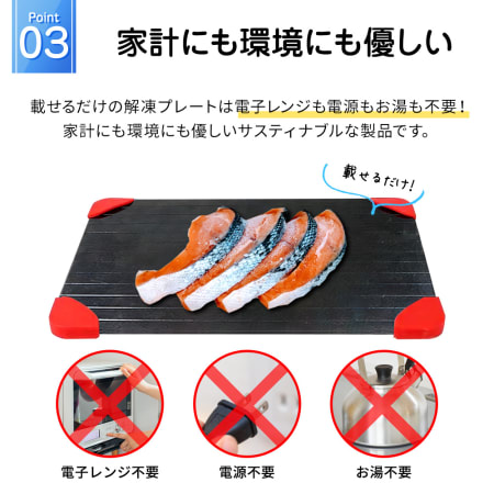 サスティナブルな秒速解凍プレートは、お湯や電子レンジ解凍に比べ電気が使わず、財布や環境にやさしい。