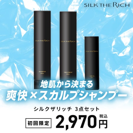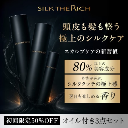 SILK THE RICH 黒金 3点セットは、最高級シルクによる補修に加え、頭皮環境の改善に特化した「スカルプケア×ダメージ補修」を両立したシリーズです。