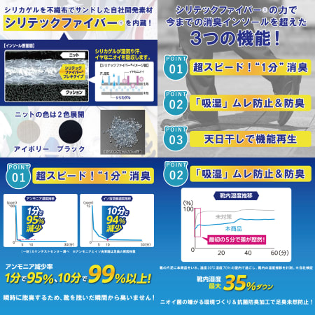 「1分でニオイがとれる!」をコンセプトに、瞬時に消臭しながらムレも防ぐ、これまでにない消臭インソールです。