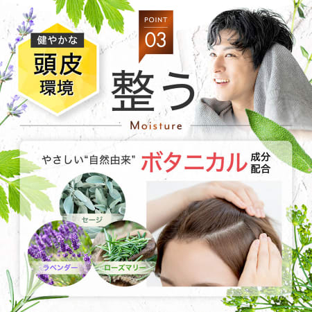 *3 酢酸トコフェロール(フケ・かゆみを防ぐ)、グリチルリチン酸2K(毛髪・頭皮を清掃)、サリチル酸(毛髪・頭皮臭を防ぐ)