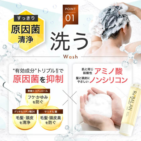 「毎日使うものだからこそ、その効果はもちろん、低刺激*4で、心まで満たされるようなものを作りたい。」そんな強い想いもと、試行錯誤の末に完成したのが、3種の有効成分*3と、毛髪補修成分として注目される「ペリセア」と「カシミアケラチン」を贅沢に配合したReBALANです。