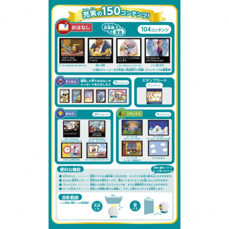 DREAM SWITCH DXセットは、ディズニー&ピクサーの人気キャラクターたちによる絵本の読み聞かせや英語学習、リラックスコンテンツなど、150種類の豊富なコンテンツを天井に投影して楽しめるおやすみプロジェクターです。録音機能やスタンプ機能など、家族みんなで使える便利な機能も充実しており、寝る前の時間を特別なひとときに変えてくれます。